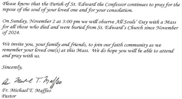 Funerals are not taped or broadcast unless pre-arranged with the Ministry of Consolation and our pastor, Fr. Mike Maffeo.